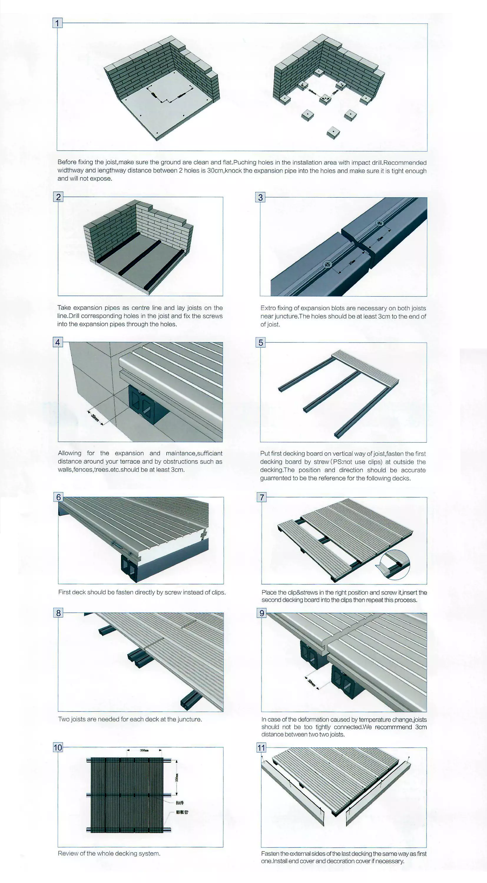 1. Considering the heat and water absorption ,WPC products will be slightly inflation,so the joist when placed should be reserved 3-5 mm from the building.